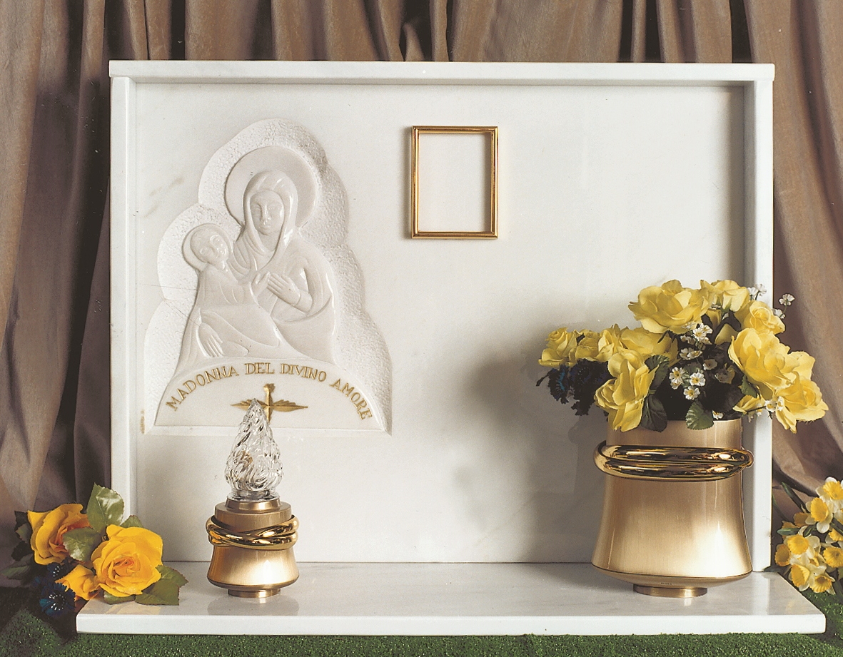 Marmo rosè come foto, epigrafe incisa, vaso e lume massello, scultura incisa volto Madonna.