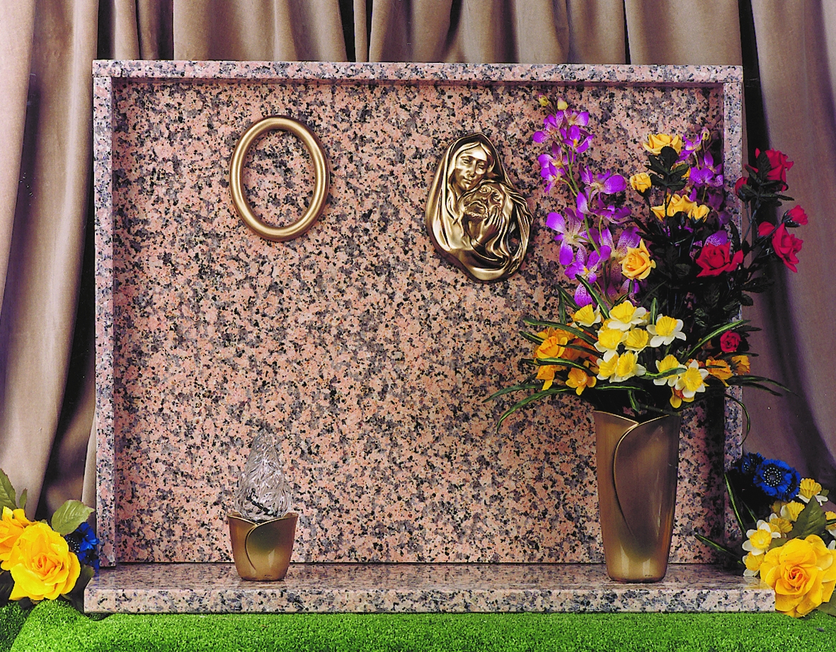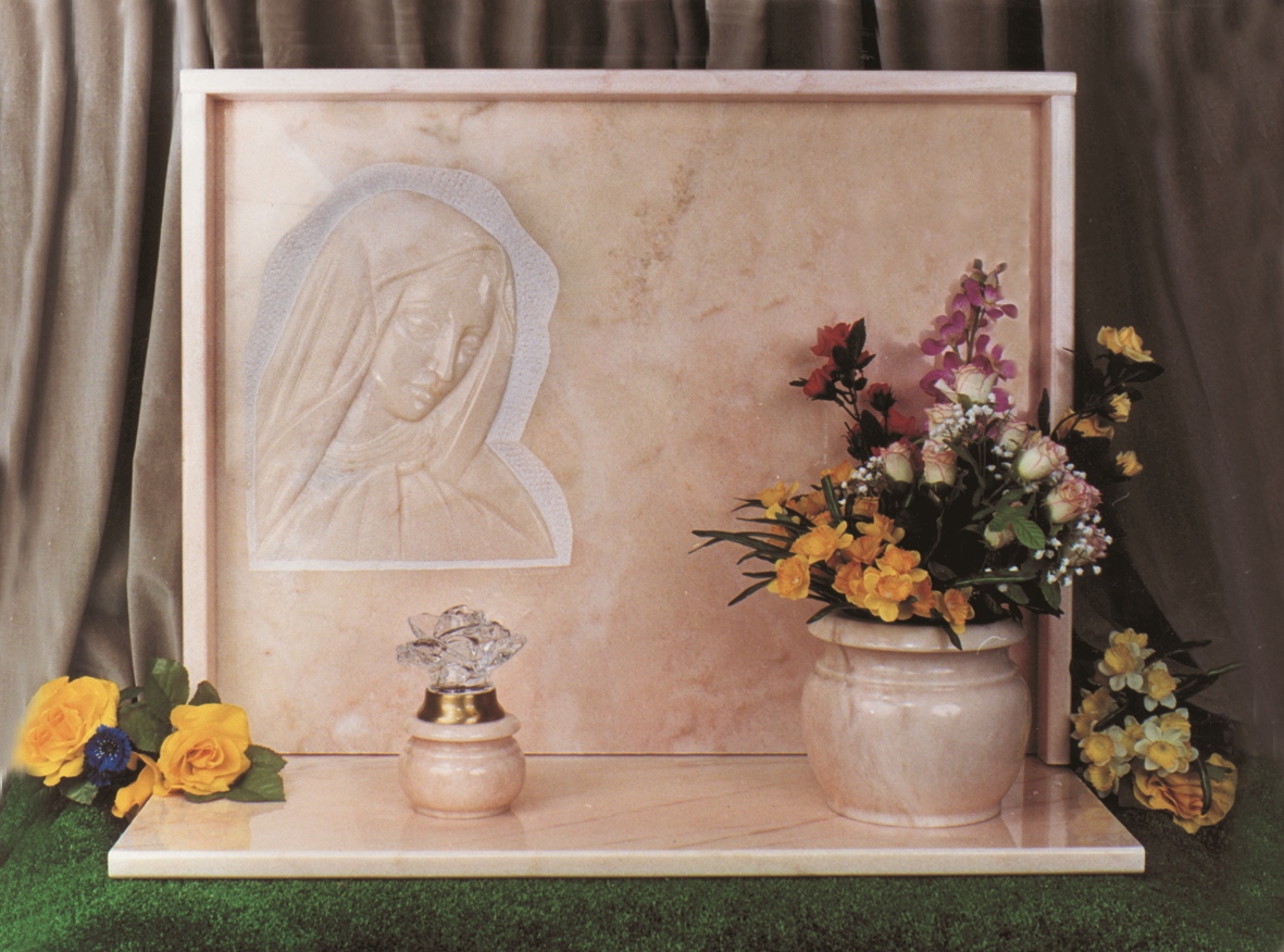 Marmo rosè come foto, modello VOLTO MADONNA ANICCHIA, epigrafe incisa, vaso e