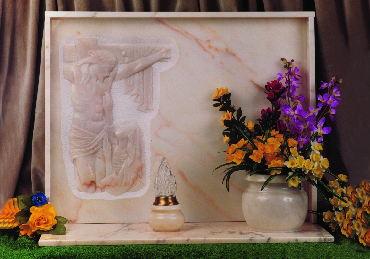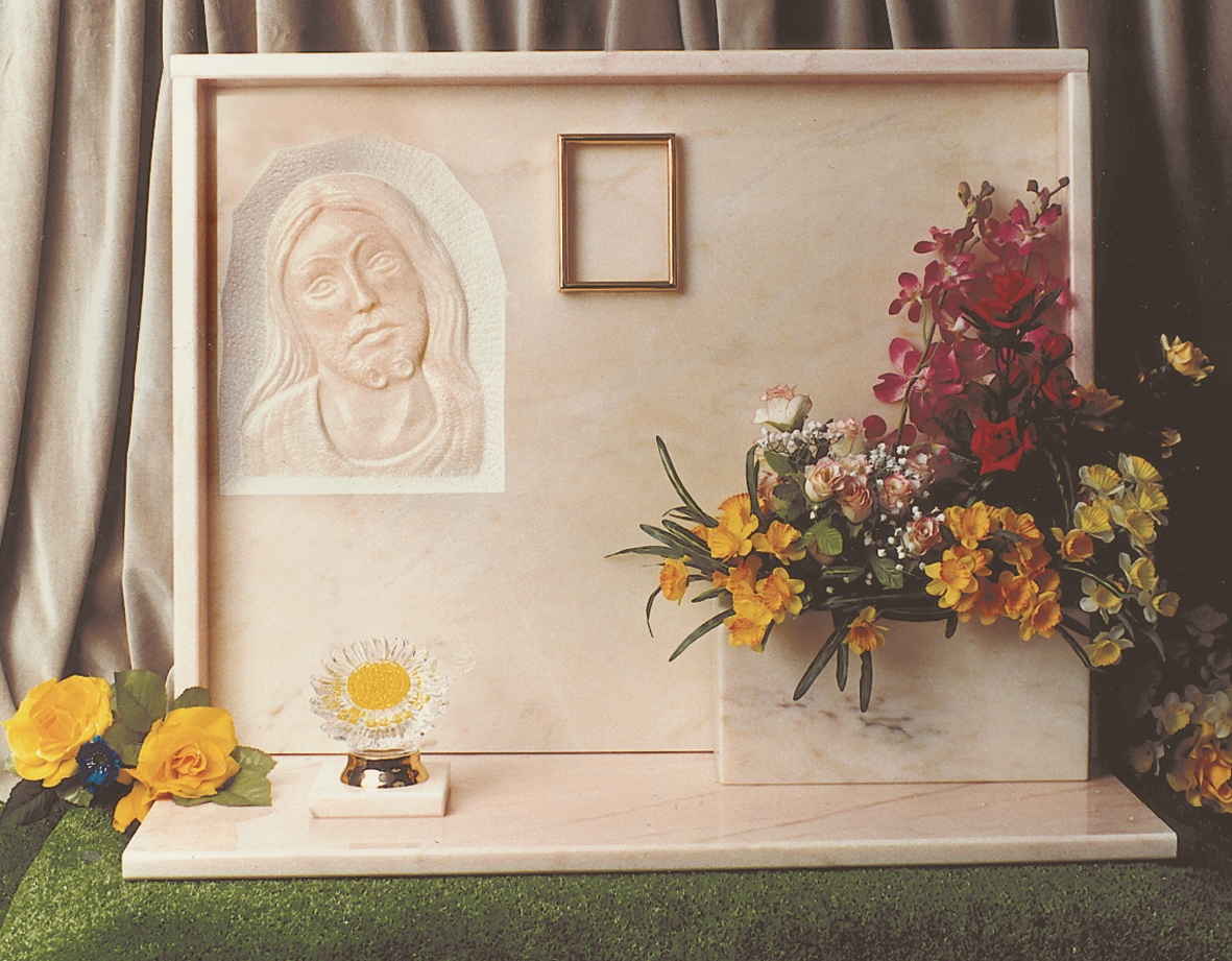 Marmo trani come foto, epigrafe incisa, scultura volto Cristo, vaso mezzaluna, lume in