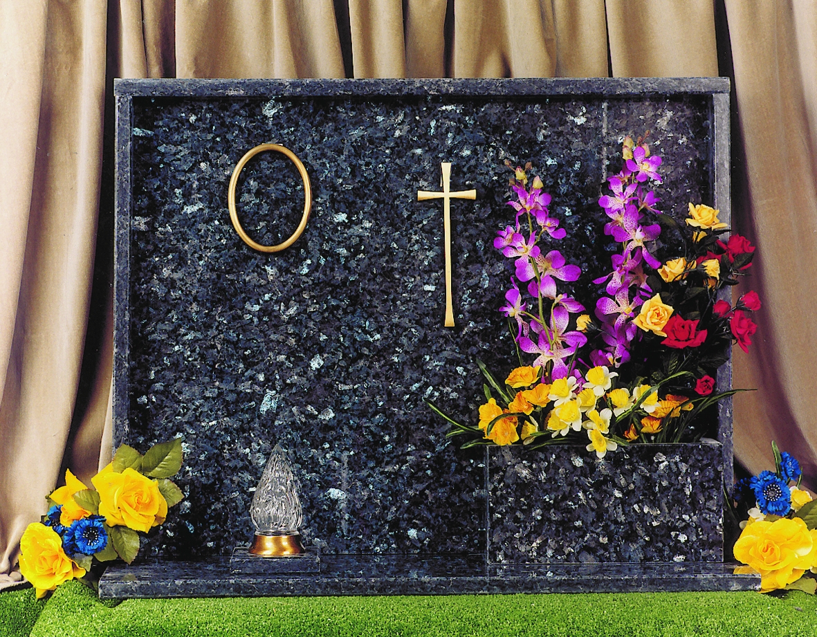 Marmo granito labrador come foto, epigrafe bronzo romano, vaso e lume in marmo, Croce