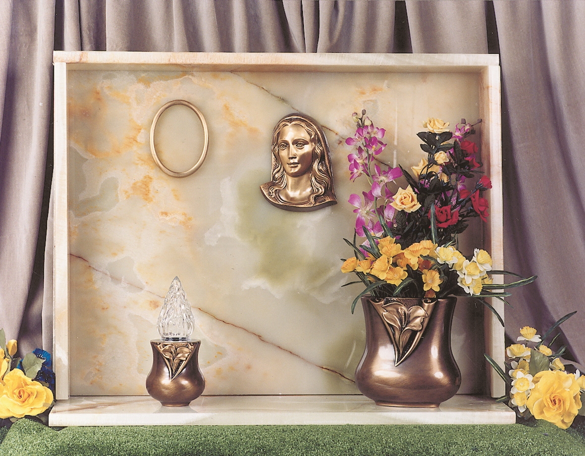 Marmo onice come foto, epigrafe bronzo romano,vaso lume e volto Madonna in